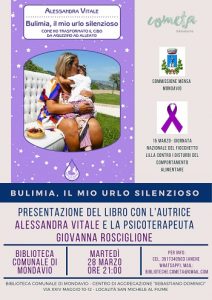 Mondavio (PU) – Dal 2012 in Italia il 15 marzo si celebra la Giornata del fiocchetto lilla contro i disturbi del comportamento alimentare, per porre l’attenzione e aumentare la consapevolezza sui disordini alimentari che colpiscono moltissime persone, soprattutto tra i giovani. Con questo intento, martedì 28 marzo alle ore 21.00, la Biblioteca Comunale di Mondavio, presso il Centro di Aggregazione “Prof. Sebastiano Dominici” di San Michele al fiume, ospiterà Alessandra Vitale, autrice del libro Bulimia, il mio urlo silenzioso. Come ho trasformato il cibo da aguzzino ad alleato (Latte di nanna edizioni, 2022), che dialogherà con la psicoterapeuta Giovanna Rosciglione. L’incontro è organizzato da CoMeta Biblioteche in collaborazione con il Comune di Mondavio – Assessorato alla Cultura e Commissione mensa.