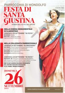 Mondolfo (PU) – Celebra Mondolfo la festa della patrona della Città e del Comune Santa Giustina domenica 26 settembre, e lo fa con un programma cadenzato in due giornate. Si inizia Venerdì 24 settembre nella Collegiata Parrocchiale con una giornata di intensa preghiera, con la celebrazione eucaristica alle ore 19 e, a seguire, l’adorazione con le confessioni sino a mezzanotte. Si arriva così a domenica 26 settembre. Al mattino non solo la Santa Messa alle ore 9 ma, ancora nella Chiesa Monumentale di S. Agostino, anche la Messa nella festa degli anniversari di matrimonio alle ore 11,15.