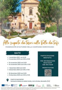 Appuntamento culturale e non solo adatto a tutta la famiglia, con ritrovo al santuario tanto al mattino quanto al pomeriggio – iscrizione gratuita ma obbligatoria – per una opportunità unica: la civiltà della mezzadria che modella questa valle marchigiana, fra Mondolfo e l’abitato di Stacciola, antico feudo dei conti Maurizi da Tolentino, luoghi già parte integrante di quel cammino turistico – religioso che coinvolge nella Diocesi di Senigallia i comuni di Castelleone di Suasa, Corinaldo e Mondolfo che è “Iter Suasanum”. Ecco le date: 1 novembre ore 14,30; 2 novembre ore 9,30 e 11,30; 15 novembre ore 14,30; 16 novembre ore 9,30 e 11,30; 7 dicembre ore 14,30; 8 dicembre ore 9,30 e 11,30; 20 dicembre ore 14,30; 21 dicembre ore 9,30 e 11,30. Per informazioni: 328 4535339 (solo WhatsApp).