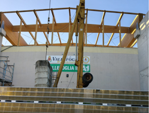 Vallefoglia (PU) – Il Sindaco della Città di Vallefoglia, Sen. Palmiro Ucchielli, insieme agli Assessori ai Lavori Pubblici Angelo Ghiselli e allo Sport Dott. Mirco Calzolari, informa che i lavori relativi al primo stralcio di interventi presso il Palazzetto dello Sport “Paladionigi” di Montecchio stanno procedendo regolarmente e nel pieno rispetto del cronoprogramma. In questi giorni, le aziende di autotrasporto stanno consegnando in cantiere i nuovi pannelli coibentati di copertura, che costituiranno il nuovo tetto sopra le travature in legno lamellare già installate.