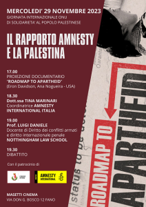 Fano (PU) – Si terrà mercoledì 29 novembre alle ore 17.00 presso il Cinema Masetti un importante evento, in occasione della Giornata internazionale della solidarietà al popolo palestinese indetta dalle Nazioni Unite, organizzato dal consigliere comunale Filippo Borioni.