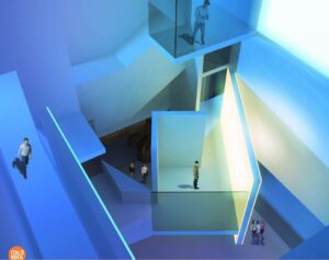Imponente sarà Vitruvium transfert: una torre dei venti a pianta quadra, che si sviluppa in un unico volume dal piano interrato fino alla sommità dell’edificio, con una altezza pari a circa 4,5 metri. La soluzione prevede l’ingresso dell’aria dalla torre del vento, la quale viene convogliata fino al piano interrato. Dal piano interrato il flusso d’aria risale verso la sommità dell’edificio, attraversando il volume espositivo e apportando benefici per il comfort degli occupanti, per fuoriuscire infine mediante delle aperture meccanizzate poste sulla copertura del “magic cube”. Magic Cube invece è uno spazio interno cubico a tripla altezza di 12 metri di lato. Suggestive saranno le “Lighting walls”, superfici caratterizzate da una serie di elementi pannellati che, poste a varie altezze, permettono l’illuminazione tecnica e scenografica del Magic Cube. I pannelli sono programmabili per determinare il colore dello spazio interno, interagendo con lo spazio eventi e spettacoli posto all’interrato. Funzionale e innovativa è la Bio-building machine, una serra bioclimatica presente sulla facciata sul lato sud. Una coltivazione idroponica di specie vegetali e una vetrata dicroica localizzata sulla facciata meridionale di tali ambienti. Infine le vetrate del prospetto su corso Matteotti sono caratterizzate da vetri tridimensionali colorati con conformazione “a bolla”.