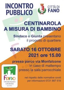 Fano (PU) – Centinarola sempre più a misura di bambino. Un progetto voluto dall’amministrazione che rientra nella “Città dei bambini e delle bambine”. Infatti sabato 16 ottobre alle 15 al parco di via Monfalcone sarà illustrata dalla giunta ai residenti la progettualità partita poco prima dell’emergenza pandemica e coordinata attraverso incontri con i bambini della scuola Raffaello Sanzio di Centinarola. Durante le riunioni si è parlato dei problemi del quartiere come la viabilità, la scuola, la mancanza di sicurezza sulle strade e i parcheggi.