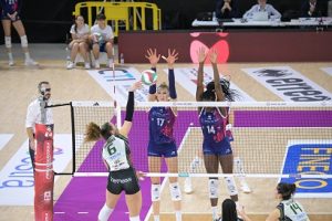 Nel terzo set Scandicci pareva decisa a chiudere la pratica: sul 3-7, Pistola toglieva Giovannini e Bartolucci per Ungureanu e Lázaro. Sul 14-7 per le toscane, pareva cominciassero a scorrere ii titoli di coda, ma un break di 4-0 chiuso da un muro di Butigan su Ruddins suonava la carica per le tigri, che impattavano con Bici a quota 19 e poi mettevano imprevedibilmente la freccia con una scatenata Omoruyi (25-20). Nel quarto set le tigri continuavano sull’abbrivio del precedente: Bici firmava il 10-6, Ungureanu l’ace del 15-10. Lázaro sciupava addirittura il +6 sul servizio successivo, Bosetti murava Bici e Franklin puniva una ricezione lunga di De Bortoli (17-19): ma la Megabox non tremava, e il cambio palla funzionava alla perfezione. Toccava ad Ungureanu chiudere con un muro su Antropova (25-22).