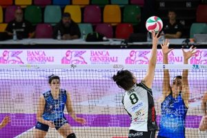 Nel secondo set Il Bisonte reagisce subito all’1-4 iniziale (altro errore di Knollema) e su un turno di servizio di Bukilic (3 ace) scappa via 11-7. Knollema sigla il +5 (15-10), poi Pistola inserisce Carletti e Ungureanu. È la romena a suonare la carica: il suo turno di servizio riporta in parità le compagne (18-18), poi è lei a firmare addirittura il sorpasso (22-21). Il finale è testa a testa, lo decide un’infrazione a rete della stessa Ungureanu (25-23).
