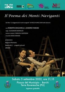 Sabato 3 settembre alle ore 21:15, Roberta Biagiarelli e Sandro Fabiani, due attori professionisti conosciuti e apprezzati in tutta la penisola, saranno in scena nella Piazza del Municipio di Barchi con la rappresentazione teatrale “Il poema dei monti naviganti”.