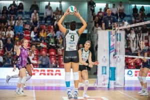 L’anno scorso le tigri strapparono alla Prosecco Doc un set nella partita giocata in trasferta, e quello fu un traguardo raggiunto non da poco. La super squadra di Daniele Santarelli schiera Asia Wolosz al palleggio in diagonale a Bella Haak, al centro Sarah Fahr e la ex-pesarese Cristina Chirichella, posti 4 nientemeno che Gabi Guimaraes e Nika Daalderop, libero l’altra ex-pesarese campionessa di tutto, ovvero Moki De Gennaro. E meno male (si fa per dire) che l’altra fuoriclasse Zhu Ting è fuori una ventina di giorni ai China National Games… In ogni caso, dalla panchina esce gente tipo la centrale ex azzurra Marina Lubian e le due giovanissime Merit Adigwe (opposta, dalle giovanili della società) e Fatoumatta Sillah (schiacciatrice dal Vasas Budapest), nonché l’altra promettente centrale Matilde Munarini. Il secondo palleggiatore è l’americana Jenna Ewert, l’anno scorso a Potsdam (Germania), il secondo libero è Serena Scognamillo, dalla A2 di Brescia.