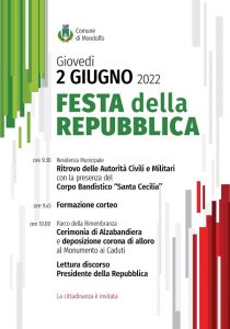 Prima della deposizione della corona di alloro al Monumento ai Caduti si svolgerà la cerimonia dell’Alzabandiera che, innalzando il tricolore al cielo, ricorderà simbolicamente il momento della nascita della Repubblica nel nostro Paese.