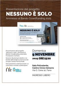 Fano (PU) – A Gimarra prende avvio “Nessuno è solo”, un progetto di solidarietà promosso dalla Parrocchia Santa Maria del Carmine in collaborazione con il Circolo Anziani del quartiere e il gruppo Caritas parrocchiale. L’iniziativa, recentemente ammessa al Bando Crowdfunding 2025 della Fondazione Carifano, nasce dall’esigenza di sostenere le famiglie in difficoltà e gli anziani soli, offrendo un aiuto concreto nella gestione dei beni alimentari e dei farmaci di prima necessità.