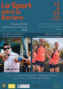 Pesaro – La Città italiana dei Giovani 2022, Pesaro apre il suo palinsesto di iniziative con “Lo Sport oltre le barriere”, appuntamento in programma lunedì 13 giugno, ore 19, nel cortile di palazzo Toschi Mosca, insieme ai due atleti paralimpici Giordano Cardellini, arciere, e Michele Baldelli, maratoneta, che racconteranno il loro percorso di rinascita attraverso lo sport.
