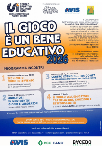 Fano (PU) – Un appuntamento fisso ormai da otto anni e che, nel tempo, ha fatto acquisire competenze e formato oltre 500 persone. Il Csi Pesaro-Urbino (sede in Fano), in vista dell’imminente ritorno dei Centri Estivi Sportivi Gioco&Sport, torna con “Il Gioco è un Bene Educativo”, un corso di formazione rivolto non solo ad operatori (o futuri tali) di centri estivi, ma anche a educatori, operatori sociali e a chiunque voglia allargare le proprie conoscenze sull’arte del giocare. 4 incontri, tutti in presenza alla palestra Tombari di Bellocchi, con esperti del settore per capire al meglio tutte le dinamiche che si creano quando si “lavora” con i più piccoli. Si parte venerdì 20 marzo con Giorgia Marcelli, infermiera e presidente dell’associazione Il Piccolo Grande Alessandro Onlus al quale è affidato il compito di impartire le tecniche base di primo soccorso.