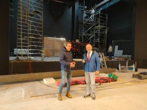 Ieri, continua il Sindaco, mentre facevo visita alla struttura ho avuto occasione di incontrarmi con il titolare della Ditta Mulazzani S.r.l. e insieme abbiamo verificato lo stato di avanzamento dei lavori che attualmente sta interessando l’interno e l’esterno del nuovo teatro. Nella parte interna, precisa il Sindaco, si stanno installando le pareti fonoassorbenti per l’acustica e le strutture che sosterranno gli apparati audio e video, mentre all’esterno dopo aver posizionato le gradinate di ingresso si sta realizzando il nuovo parcheggio a fianco della struttura.