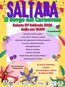 Saltara di Colli al Metauro (PU) – L’ACLI in collaborazione con la Pro-Loco di Saltara e l’Istituto Comprensivo “G. Leopardi”, invitano ad un pomeriggio divertente per tutta la famiglia! Sabato 7 febbraio 2026 dalle ore 15:00, nel centro storico di Saltara, si terrà la 4ª edizione de “Il Borgo del Carnevale”. In questa occasione ci saranno una serie di attività di intrattenimento per grandi e piccini: balletti e laboratori creativi a cura dell’I.C. “G. Leopardi”, trucca-bambini, pesca della fortuna, e giochi a cura dell’oratorio Santa Croce e attività di manipolazione del gommapiuma con il Laboratorio Geniale. La Proloco d Saltara organizza uno stand gastronomico con dolci tipici e offre una tazza di cioccolata calda a tutti i bambini; sfilate in maschera e il tradizionale lancio di caramelle. Il tutto a suon di musica con i Dj di Radio Esmeralda e la Banda Musicando di Colli al Metauro.