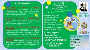 Il programma di “Estate a Villa Betti” si svolgerà dal 4 al 30 luglio, il lunedì, mercoledì e venerdì dalle 16 alle 18, in via Rossini 2 a Villa Betti ed è rivolto a due fasce d’età: quella dai 3 ai 6 anni e quella dai 6 agli 11. Le iniziative dei pomeriggi ruoteranno intorno alle avventure di Giovannino Perdigiorno, il personaggio frutto della penna di Gianni Rodari che accompagnerà i bambini, per tutta l’estate, nei vari laboratori e in tanti momenti di divertenti alla scoperta del territorio tra orto-therapy, la costruzione di macchine fantascientifiche, mini-corsi di cucina e teatro.